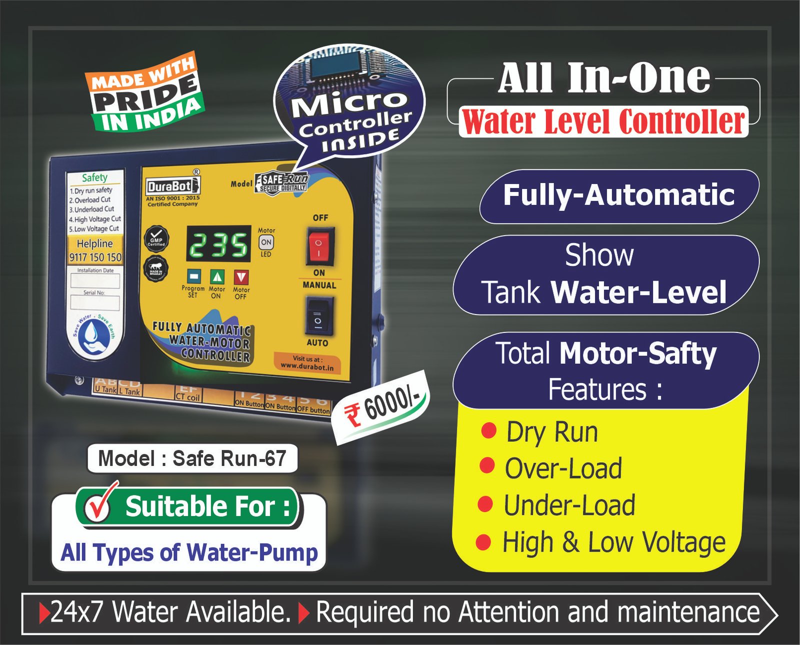 - Auto start as soon as water supply comes, also if the upper tank is empty.
